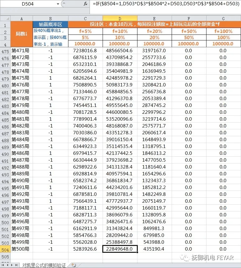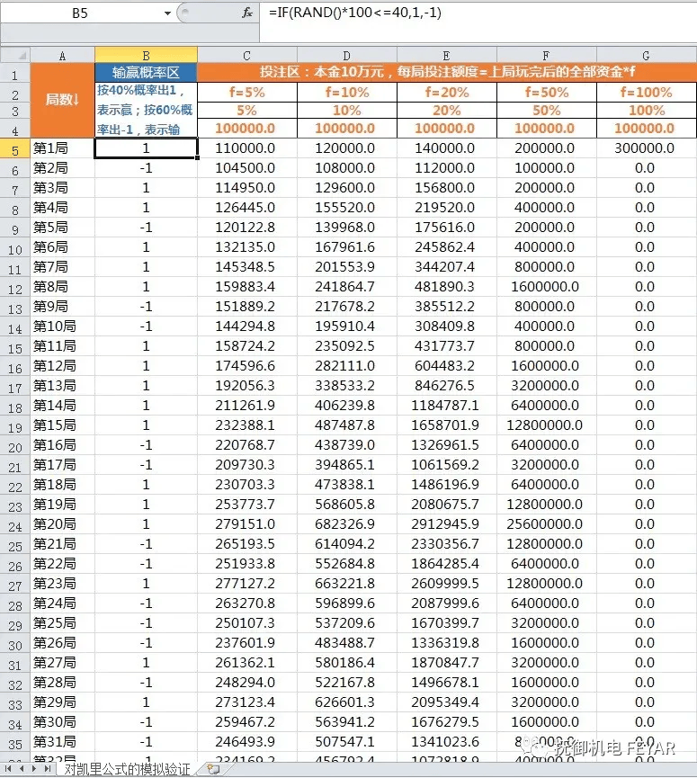A列为玩赌局的局数。B列为输赢概率区,用Excel的随机函数RAND,按40%概率出“1”,表示赌局“赢”;按60%概率出“-1”,表示赌局“输”。C到G列为投注区,表示每次分别拿出手上全部资金比例的5%、10%、20%、50%和100%,投注到下一次的赌局中。