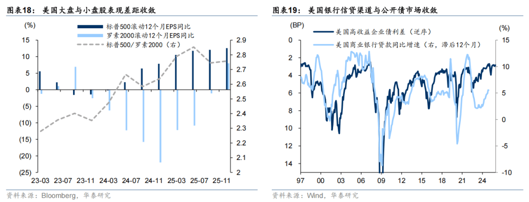 AI科技+财政减税+货币政策偏紧的环境是经济K型分化的“温床”。不过2025年下半年,AI泡沫论+货币进一步宽松+信用周期回暖,美国K型分化出现了小幅收敛的迹象。一方面,权益市场不再是大盘科技股一支独秀,小盘股的盈利增速逐渐赶上大盘,股价上也阶段性跑赢;另一方面,商业银行信贷同比加速增长,趋势上呈现对高收益债利差的追赶势头,可能反映无法进入公开债市场、资质较弱企业的信贷环境在较快改善。