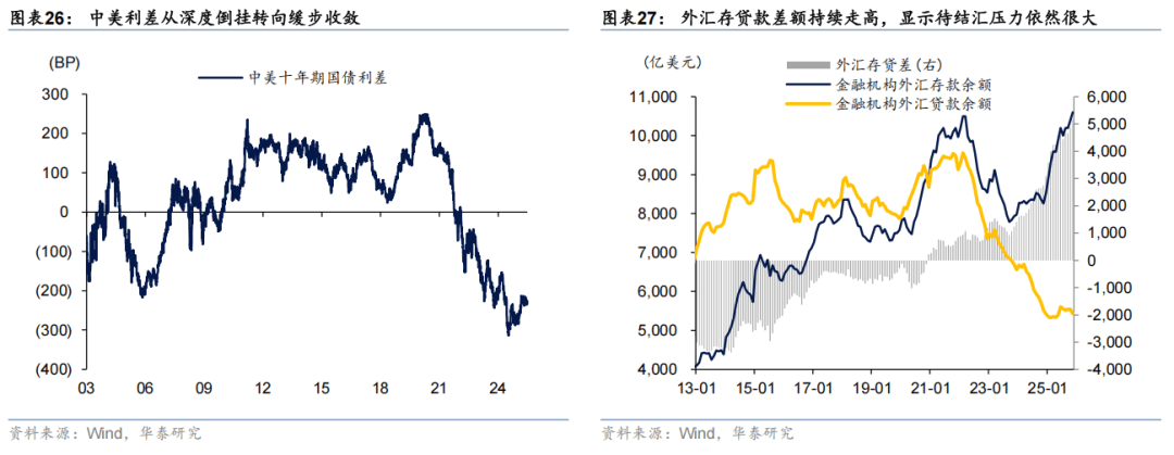 2)2025年美联储多次降息,中美利差倒挂有所收窄。年底市场进一步憧憬2026年美国降息前景,叠加中国名义增速回升的预期趋于一致,市场形成了“中美利差倒挂最深的阶段正在过去”的共识。