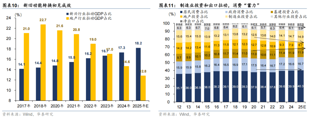 过去几年,我们处在新旧动能转换的左侧阶段,表现为旧经济下行,而新经济体量尚小,故事的主角在供给/产业升级。新质生产力导向,地方政府通过招商引资引入产能,金融支持实体经济等共同作用下,推动中国从制造业“大”国成为制造业“强”国。而需求端恰逢房地产下行,政府部门过紧日子,企业降本增效,导致内需偏弱。于是,我们看到宏观层面形成了明显的“温差”,实际GDP不弱,但价格信号相对疲软,企业感受越来越“卷”等现象。