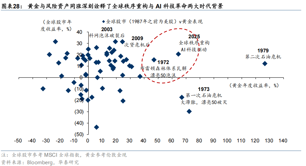 第一、风险资产(权益)与避险资产(黄金)同涨成为历史上少有的现象,除了流动性宽松外,可能分别在交易AI科技革命和全球秩序冲击;
