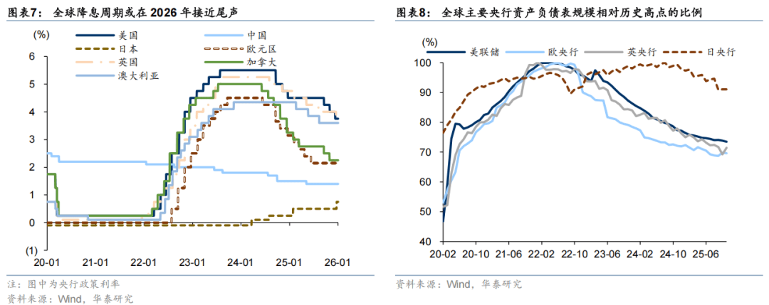 2025年大类资产普涨,全球降息周期→分母端扩张是重要贡献。不过进入2026年,随着全球央行降息进入尾声,叠加政府部门进一步增加支出,财政扩张将更为显性,而货币政策将转为配合与支持,或形成“财政扩张+货币配合”的新模式。