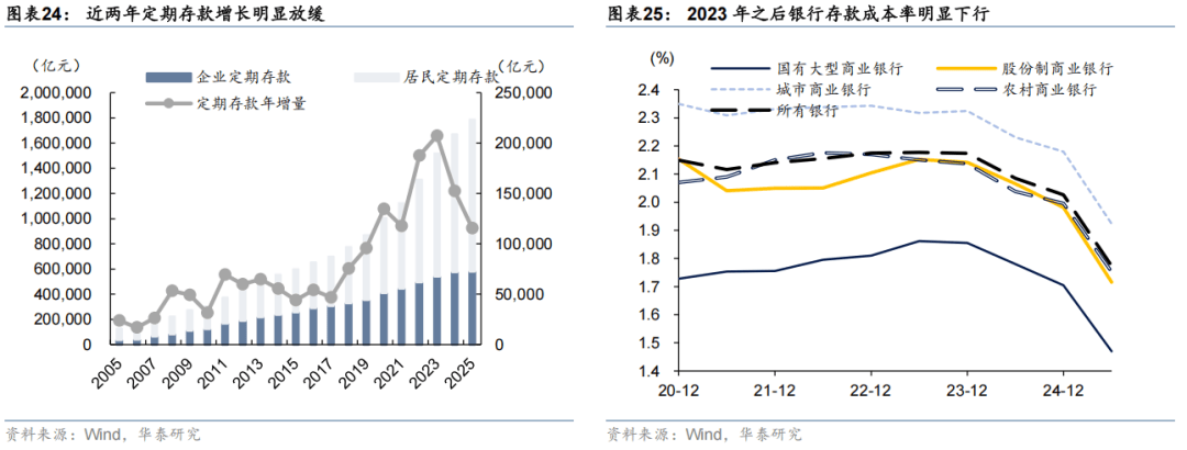 逻辑上,存款到期重定价有助银行净息差压力缓解,但存款收益降低也会导致银行存款“搬家”及活期化倾向。在此背景下银行面临继续高息揽储(无高息资产对接,息差继续承压)和随行就市(存款流失和缩表风险)两难。考虑到反内卷的政策导向,我们认为后者概率偏高,这将给银行负债端带来不小压力,进而弱化资产端承接债券的能力。而存款搬家对非银等配债需求和股市流动性更为友好。