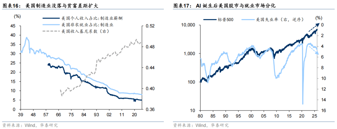 美国经济与社会呈现出明显的K型分化。美国K型经济的问题可以追溯到上世纪八十年代,产业空心化叠加资本和科技要素收入分配占比的不断提高,直接导致了美国中低端产业工人锐减且贫富差距扩大。AI革命以来,AI投资成为推动美国经济增长的关键因素,但AI替代就业导致失业率提升,美国呈现出无就业复苏。与此同时,AI革命导致失业率和股市出现了历史罕见的背离,加剧华尔街(Wall Street)与主街(Main Street)之间的矛盾。