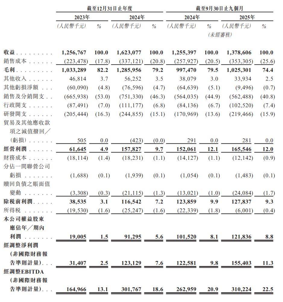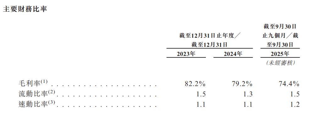 于2023年度、2024年度以及2025年截至9月30日止九个月,公司录得毛利率分别为82.2%、79.2%、74.4%。